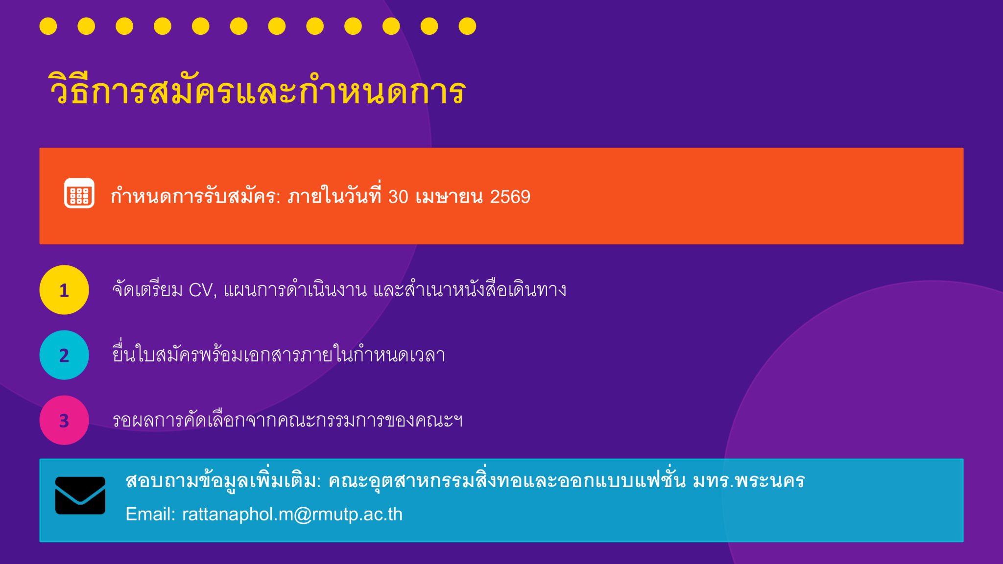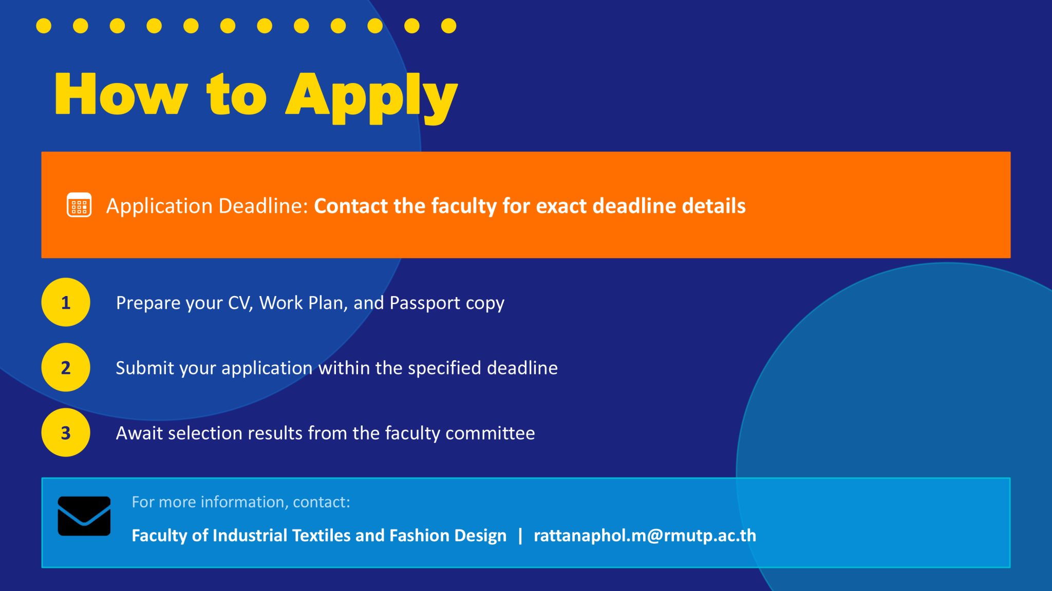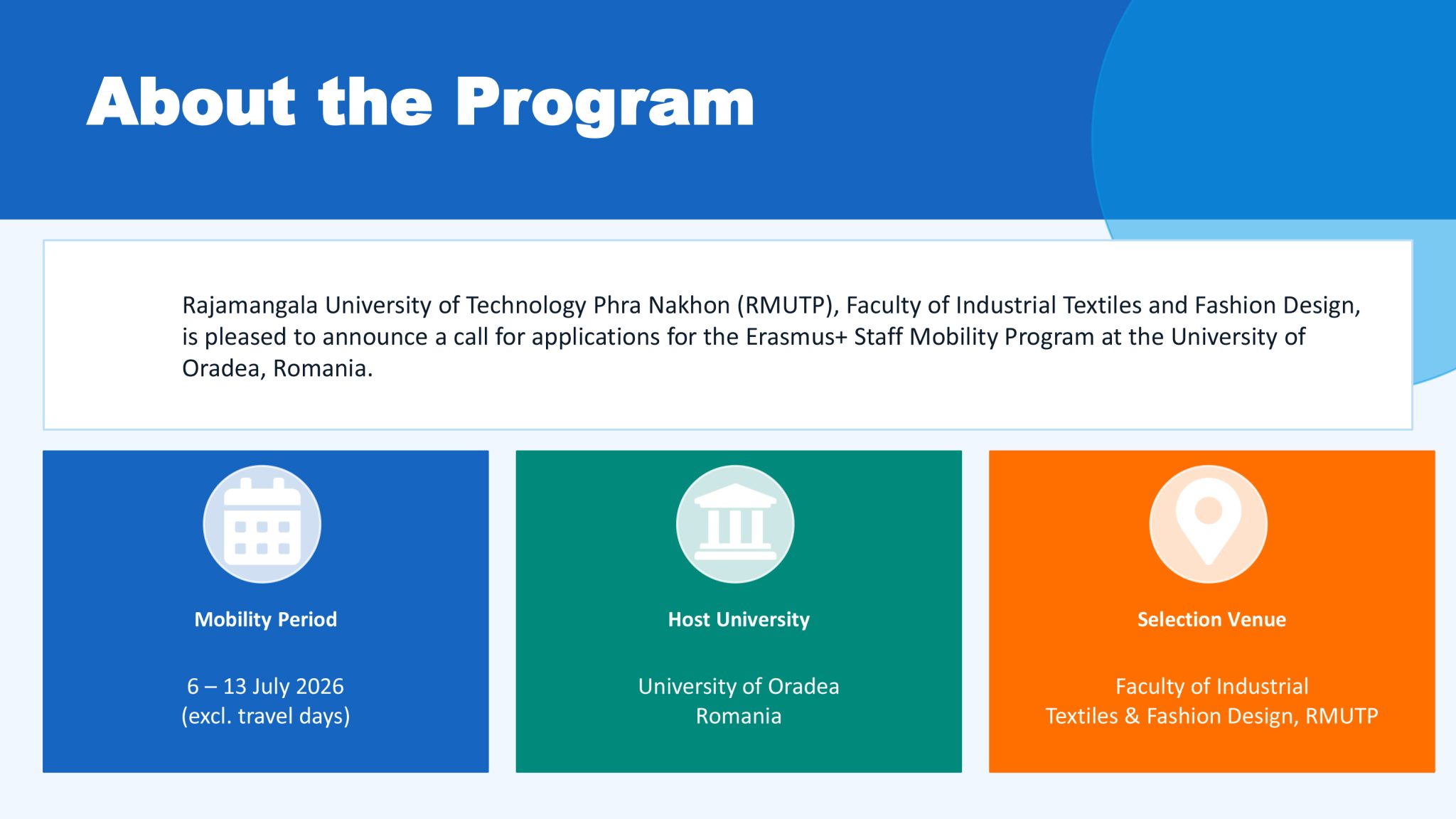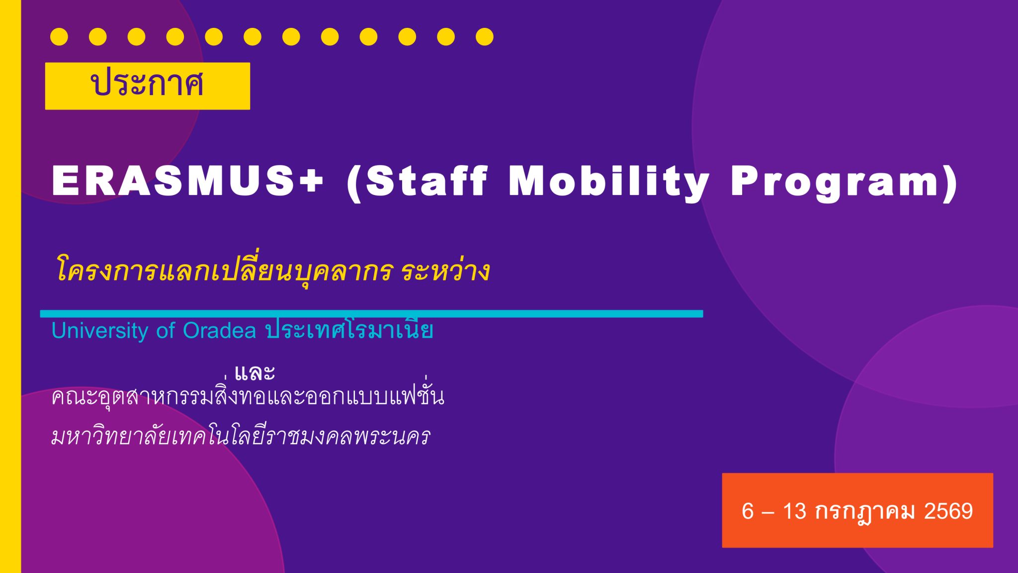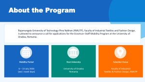 The Faculty of Industrial Textiles and Fashion Design, Rajamangala University of Technology Phra Nakhon, invites staff members to apply for the Erasmus+ Staff Mobility Program at the University of Oradea, Romania. Please refer to the attached document for further