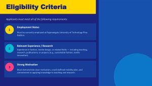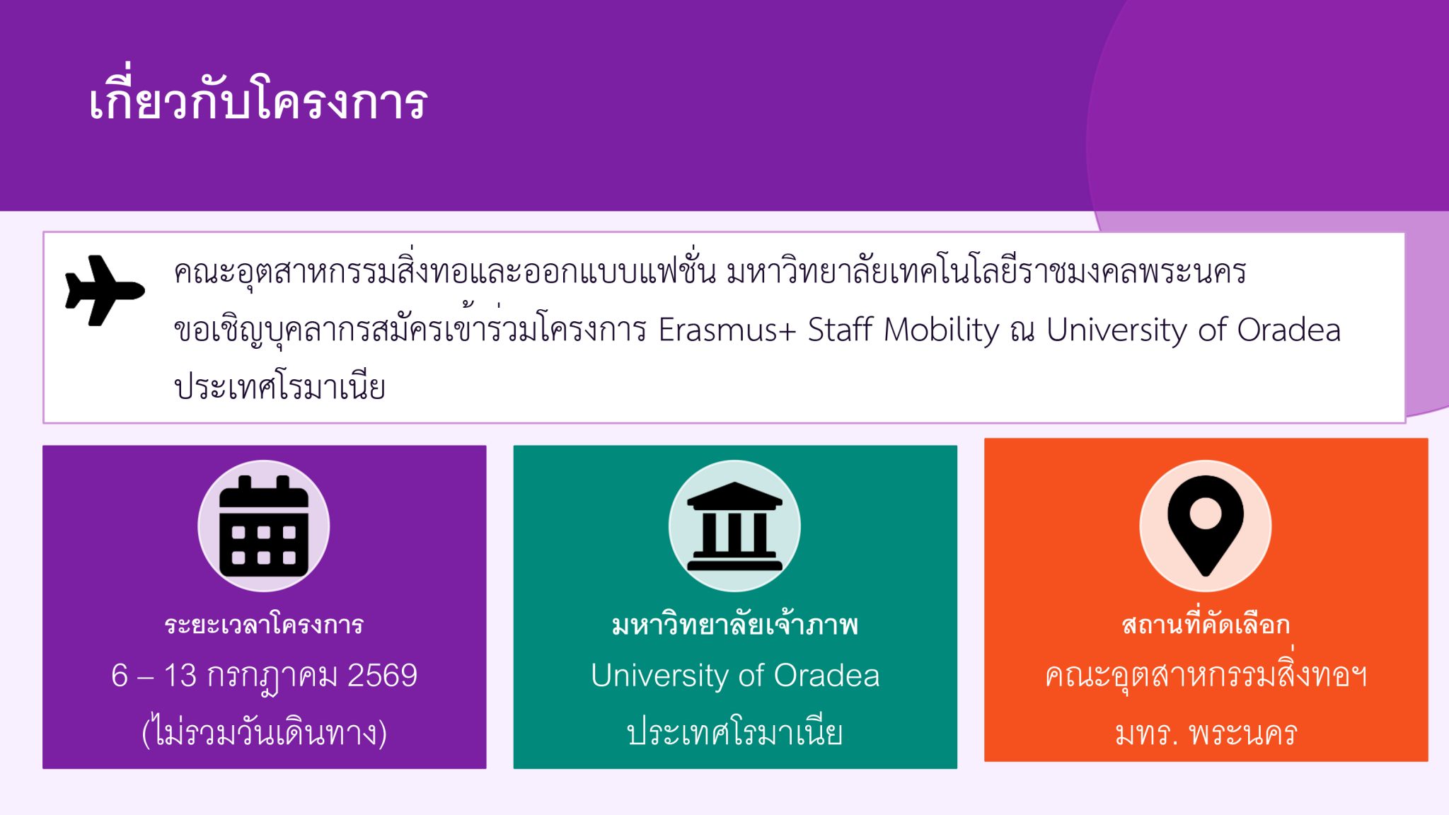 คณะอุตสาหกรรมสิ่งทอและออกแบบแฟชั่น มหาวิทยาลัยเทคโนโลยีราชมงคลพระนคร ขอเชิญบุคลากรสมัครเข้าร่วมโครงการ Erasmus+ Staff Mobility ณ University of Oradea ประเทศโรมาเนีย โดยท่านสามารถศึกษาดูรายละเอียดได้จาก เอกสารที่แนบมานี้