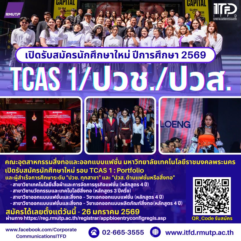 คณะอุตสาหกรรมสิ่งทอและออกแบบแฟชั่น มหาวิทยาลัยเทคโนโลยีราชมงคลพระนคร เปิดรับสมัครนักศึกษาใหม่ประจำปีการศึกษา 2569 รอบ TCAS 1 : Portfolio เปิดรับสมัครตั้งแต่วันนี้ – 26 มกราคม 2569 โดยคณะอุตสาหกรรมสิ่งทอและออกแบบแฟชั่น เปิดรับสมัครจำนวน 3 สาขาวิชาได้แก่ – หลักสูตรเทคโนโลยีเสื้อผ้าและการจัดการธุรกิจแฟชั่น (หลักสูตร 4 ปี) – หลักสูตรนวัตกรรมและเทคโนโลยีสิ่งทอ (หลักสูตร 3 ปีครึ่ง) – หลักสูตรออกแบบแฟชั่นและสิ่งทอ – วิชาเอกออกแบบแฟชั่น (หลักสูตร 4 ปี) – หลักสูตรออกแบบแฟชั่นและสิ่งทอ – วิชาเอกออกแบบผลิตภัณฑ์สิ่งทอ(หลักสูตร 4 ปี) สมัครได้เลยที่ https://reg.rmutp.ac.th/registrar/appbioentryconfigregis.asp รายละเอียดรอบ TCAS 1 https://admission.rmutp.ac.th/upload/TCAS1-69.pdf สำหรับผู้ที่จบ ปวช. ทุกสาขาวิชา สามารถสมัครเข้าเรียนในระดับปริญญาตรี ทั้งสามสาขาได้เช่นกัน โดยเลือกสมัครในส่วน “โควตาระดับปริญญาตรี” ในส่วนของผู้ที่จบการศึกษาระดับ […]