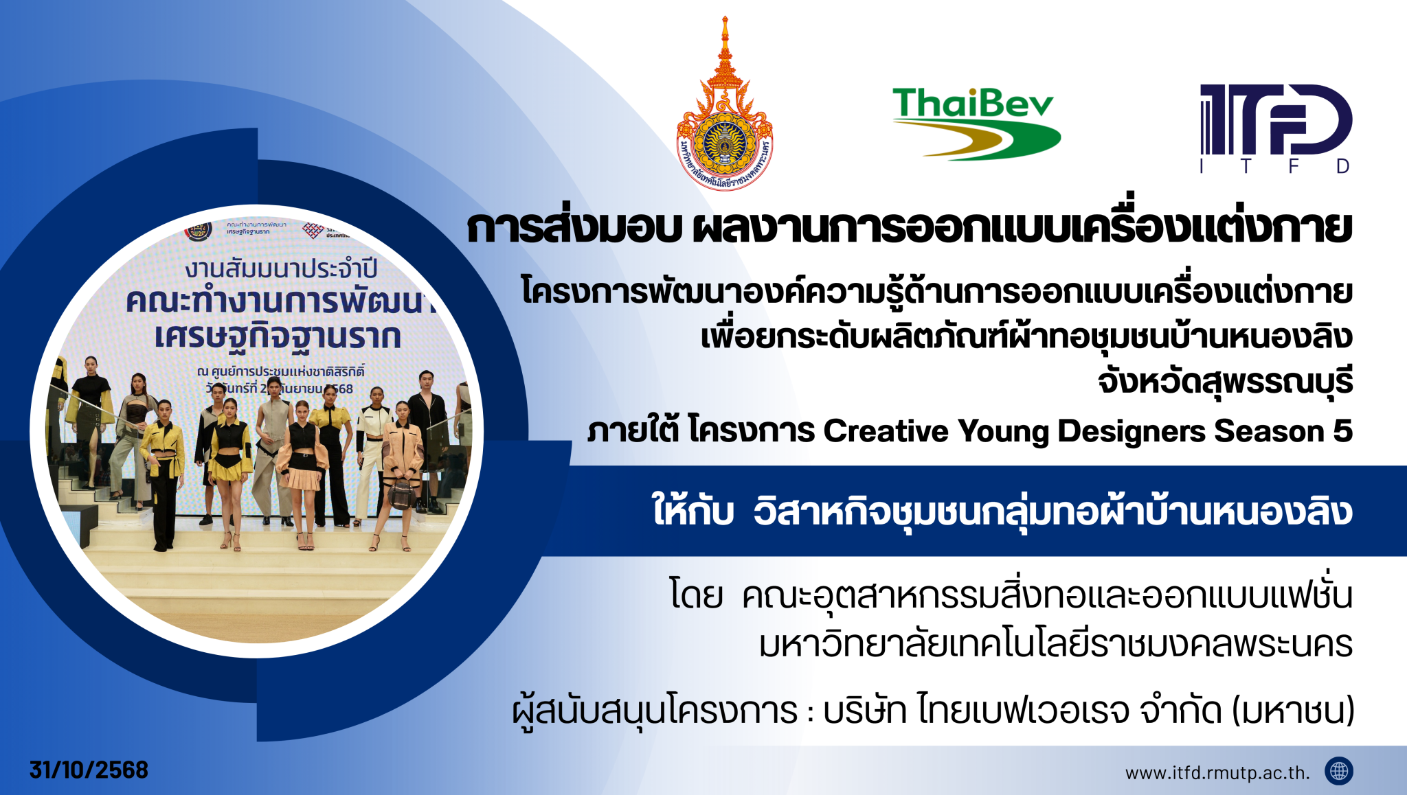 เมื่อวันที่ 31 ตุลาคม 2568 รองศาสตราจารย์ ดร.รัตนพล มงคลรัตนาสิทธิ์ คณบดีคณะอุตสาหกรรมสิ่งทอและออกแบบแฟชั่น มหาวิทยาลัยเทคโนโลยีราชมงคลพระนคร พร้อมคณะผู้บริหาร อาจารย์ และเจ้าหน้าที่ ร่วมกับตัวแทนจาก บริษัท ไทยเบฟเวอเรจ จำกัด (มหาชน) เดินทางลงพื้นที่วิสาหกิจชุมชนกลุ่มทอผ้าบ้านหนองลิง อำเภอสองพี่น้อง จังหวัดสุพรรณบุรี เพื่อส่งมอบผลงานการออกแบบเครื่องแต่งกายและกระเป๋า ภายใต้โครงการ “Creative Young Designer Season 5”